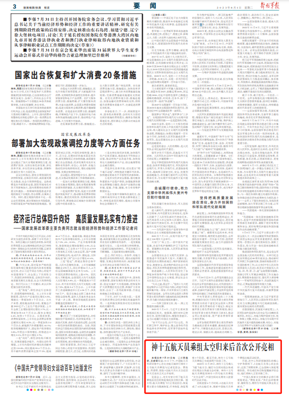 ▲这篇文章刊登于8月1日的《解放军报》第3版。在场的航天员费俊龙(中)和邓清明(右)向人们敬礼表示问候。并持续努力奋斗。