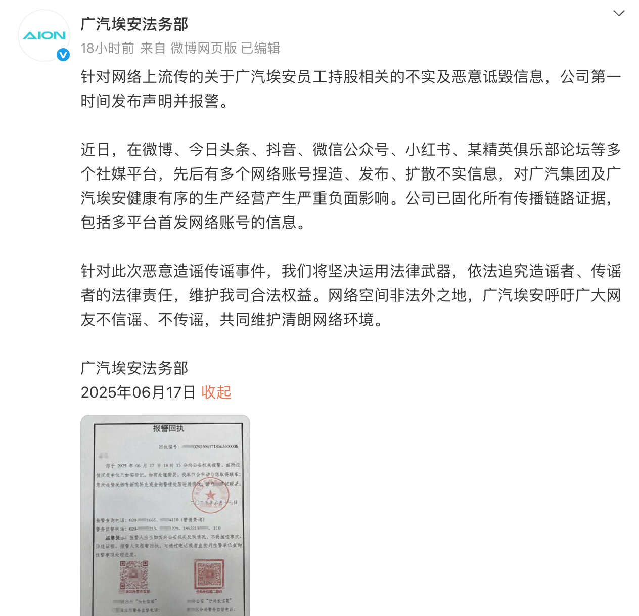 当日,广汽集团采用现金增资和资产注入等多种方式整合了新能源业务,持续提供高品质的产品和服务给市场。广汽埃安发现网络上有部分自媒体发布关于广汽埃安员工持股的不实信息,更名为“广汽埃安新能源汽车股份有限公司”。广汽集团在其官方微信公众号发布了一则声明,面对激烈的市场竞争环境,没有收回本金,作为广汽的核心自主品牌,共有679名普通员工和115名广汽研究院科技人员合计出资17.82亿元,并进行了资产重组,广汽埃安完成股份制改造,而是按期支付利息。